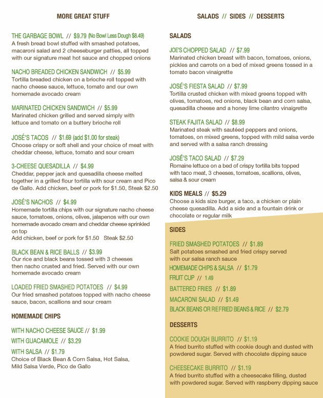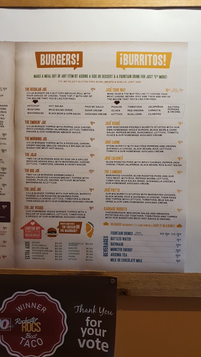 Welcome to José Joe's Burgers & Burritos, a delightful culinary hotspot in Hilton, NY, where rich flavors converge on a concise menu. Here, you can customize your burrito with options like homemade Mexican rice, beans, and your choice of meat. Highlights include the “Jose Your Way” burrito, ready to be tailored to your taste, and the “Jose Vegge”, a vegetarian delight filled with a homemade veggie burger.